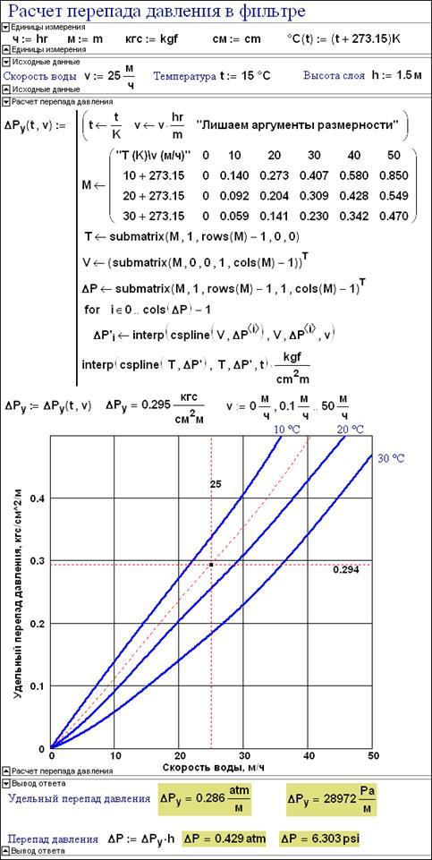 На рис. 2 показан универсальный Mathcad-документ автоматизации работы с семейством кривых. Его универсальность в том, что в матрице исходных данных можно произвольно менять значения элементов, число строк и столбцов. Левая «девятка» матрицы хранит названия боковика и шапки таблицы.. Программно создается функция пользователя с именем ΔPу и с двумя аргументами. Функция содержит в матрице M опорные точки интерполяции (результаты обмера графика линейкой) с боковиком (первый аргумент функции – температура) и шапкой (второй аргумент – скорость). Еще одна особенность функции, созданной с среде Mathcad, – возможность ее работы с размерными величинами, что позволяет вводить данные с любыми единицами скорости и температуры и иметь ответ также в разных единицах не только в числах, но и на графиках. Контроль размерностей, кроме того, позволяет выявить разного рода опечатки и ошибки в исходной документации. Так на исходном графике, показанном на рис. 1, перепад давления измеряется в кг/см2, а должно быть кгс/см2 (атмосфера техническая).