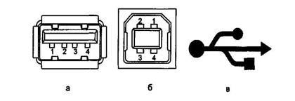 Рис. 7.5. Гнезда USB: а - типа "А", б - типа "В", в - символическое обозначение