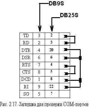 Тестирование портов с помощью диагностических программ позволяет проверить их выходные регистры, а при использовании специальных заглушек — и входные линии. Поскольку количество выходных линий порта (12) и входных (5) различно, то полная проверка порта с помощью пассивной заглушки принципиально невозможна. Разные программы тестирования требуют применения специально на них ориентированных заглушек (рис. 1),