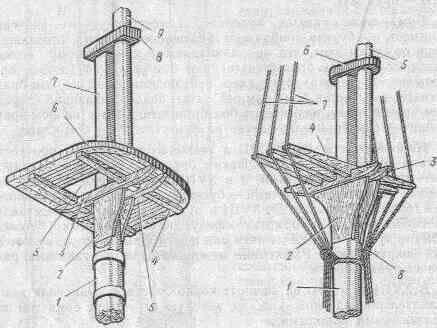 1 - нижняя мачта (колонна); 2 - чиксы; 3 - лонг-салинги; 4 - краспицы; 5 - собачьи дыры; 6 - марс; 7 - топ мачты; 8 - эзельгофт; 9 - стеньга.