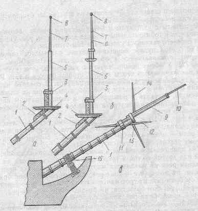 а - XVIII в.; б - конца XVIII в.; в - первой половины XIX в.; 1 - бушприт; 2 - кница; 3 - бушпритный эзельгофт; 4 - марс; 5 - блинда-стеньга; 6 - блинда-брам-стеньга; 7 - флагшток; 8 - клотик; 9 - утлегарь; 10 - бом-утлегарь; 11 - эзельгофт; 12 - блинда-гафель; 13 - мартин-гик; 14 - гюйс-шток; 15 - тросовый вулинг.
