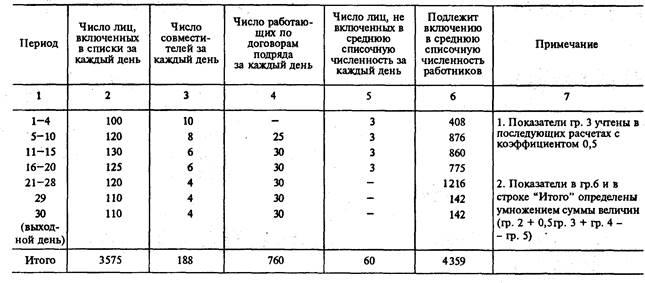 Отметим далее, что по приведенным выше данным можно определить среднюю списочную численность, а также по выделенным в таблице группам персонала (не следует только забывать, что данные по совместителям следует применять с коэффициентом 0,5). Тогда после деления соответствующих показателей итоговой строки табл.2 на 30 (число календарных дней в апреле) получим среднее списочное число лиц, состоящих в списках, 119 человек, совместителей — 3 человека, работавших по договорам подряда — 25, лиц, подлежащих исключению из среднего списочного числа, хотя и состоящих в списках, — 2 человека, что в сумме и дает 145 человек.