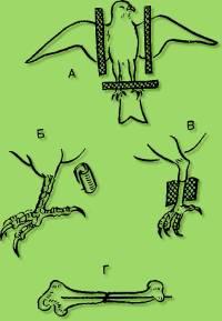 Лечение переломов конечностей. Для того чтобы получить положительный результат при переломах конечностей, пациенту предоставляют полный покой. Мелкие переломы пальцев и подошвы ног у небольших птиц просто обрабатывают наложением лейкопластыря, у крупных птиц применяют шину из различного материала, например пластиковую оболочку от провода, стержень пера с удаленным содержимым. Все виды шин особенно необходимы при переломах нижней части стопы. При их применении, если птица находится в спокойном состоянии, не образуется костных мозолей. Легкие гипсовые повязки следует рекомендовать для птиц с короткими конечностями, например для уток. Птица, обладающая сильным клювом, в короткий период времени может разрушить повязку.