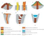 Ко второму типу грязевых вулканов (рис. 2, II ) относятся постройки, возникающие за счет периодического поступления на поверхность полужидких масс грязебрекчий; во время очередного извержения они растекаются от кратера к периферии вулкана, надстраивая вулканическое сооружение и увеличивая, таким образом, объем концентрически построенного конуса.