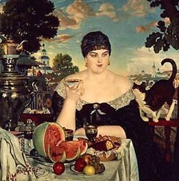 В картине "Купчиха" художник восхищается пышущей здоровьем, полногрудой статной русской красавицей, в которой есть что-то необычайно пленительное. Солнечные, желтые, розовые, синие краски пейзажа перекликаются с коричнево-красным тоном ее платья, цветной шалью, и вместе все сплетается в яркий красочный букет.