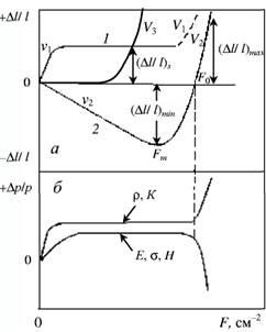 При низкотемпературном облучении (< 300 °С) усадка отсутствует, а первичное распухание V] стабилизируется на определяемом температурой уровне (А///),. При высоких дозах оно переходит во вторичное распухание со скоростью Vl (рис. la, кривая 7). Облучение при средних температурах (350—800 °С), соответствующих рабочим, вызывает усадку, идущую в водографитовых реакторах в течение 20—25 лет с постоянной скоростью v2. Усадка при Fm сменяется вторичным распуханием со скоростью V2 (кривая 2 на рис. 1). При высокотемпературном облучении (>900 °С) начальная усадка невелика или отсутствует и переходит во вторичное распухание со скоростью V$ (кривая 3).