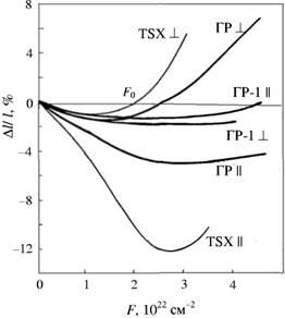 Рис. 2. Зависимость от флюенса нейтронов относительного изменения размеров образцов (/У//) реакторных графитов.