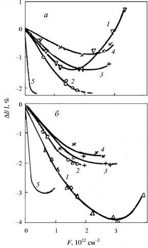 Рис. 1. Зависимость относительных изменений размеров (а) и физических свойств (б) графита от флюенса нейтронов (/).