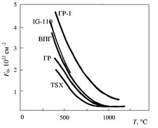 Накопленные данные позволили наметить область надежной эксплуатации (life-time) реакторного графита ГР, что существенно прежде всего для прогнозирования ресурса кладок действующих реакторов. Для перпендикулярного направления, где вторичное распухание начинается раньше по дозе, на рис. 5 нанесена зависимость критического флюенса F0 от температуры. С ее ростом он снижается. Левее кривой — область, где вторичное распухание еще не развилось. Правее — область, в которой оно превалирует и идет с постоянной скоростью. Здесь графит может работать, теряя свою прочность ниже исходного значения до облучения. При этом разрушения кладки под собст-