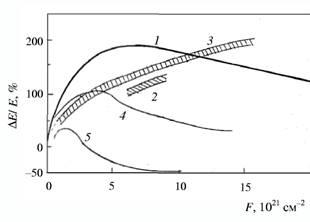 2 - БиАЭС; 3 - ЛАЭС-1; 4 - АВ-2; 5 - АМ-1. Температура облучения 500—600 °С (1—4) и 350—450 °С (5)