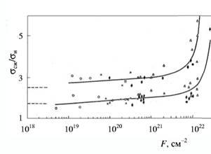 На рис. 7 в качестве иллюстрации приведены дозовые зависимости относительного изменения предела прочности при сжатии образцов ГР, облученных в исследовательских реакторах, и этого же графита, высверленного из кладок различных реакторов. Видно, что прирост прочности графита из работавших блоков кладки реакторов БиАЭС (ЭГП-6) и РБМ-К (ГР), где критический флюенс не был достигнут и вторичное изменение свойств еще не началось, совпадает с таковым у облученных без окисления образцов графита марки ГР [25].
