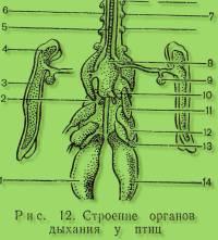 Строение органов дыхания птиц и общие сведения о заболеваниях дыхательных путей. Трахея птиц не обладает, как у млекопитающих, единой гортанью. Она разделена на верхний участок гортани, который соединяется с носовой полостью, и нижний участок трахеи, который разветвляется на два больших бронха (рис. 12) Легкие разделены реберными перегородками. Они не просто оканчиваются альвеолами, как у млекопитающих, а переходят в так называемые воздухоносные мешки, которые проникают в различные отделы тела и даже частично в кости. Капиллярная сеть легких, стенки воздухоносных мешков ответственны за газообмен.