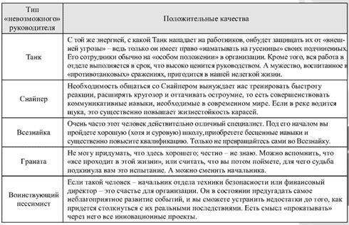 И, поскольку все в природе уравновешено, не будем забывать о хороших сторонах «невозможных» руководителей. В таблице представлен только минимум, остальное додумайте сами, глядя на любимого начальника.