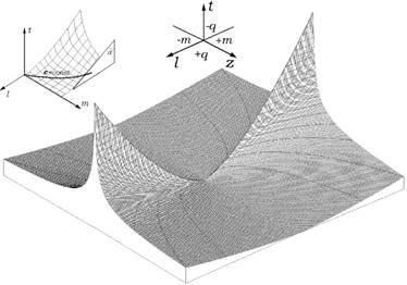 Мировая поверхность положительных замкнутых пространств-времени располагается в четвертом октанте декартовой системы координат, в области положительных значений времени t, гравитационных масс m и отрицательных пространственных координат l. Мировая поверхность антипространств-времени располагается во втором октанте, соответствующем положительному времени, пространственным координатам и отрицательным значениям гравитационного заряда.