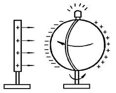 В данном изложении приводится описание одного из экспериментов, наиболее просто демонстрирующем суть полученных результатов. Известно, что если токопроводящий шар внести в потенциальное электростатическое поле, то в нем произойдет перераспределение зарядов по закону электростатической индукции (рис. 1). В наших экспериментах шару придали вращение, что ранее никем не рассматривалось.