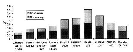 На основании полученных нами результатов всестороннего (свыше 200 параметров) анализа более 50 шин различных моделей и производителей можно заключить, что на Российский рынок поступают заметно различающиеся по экологическим, техническим и эксплуатационным характеристикам шины, в том числе под торговыми марками ведущих шинных фирм. Некоторые результаты экологического анализа представлены на рис. 2.
