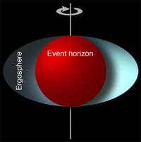 Но и это не всё. Дыра в своем вращении увлекает за собой окружающее пространство. В непосредственной близости от дыры увлечение полное, на периферии оно постепенно слабеет. Поэтому горизонт дыры погружен в особую область пространства — эргосферу. Граница эргосферы прикасается к горизонту у полюсов и дальше всего отходит от него в плоскости экватора. На этой поверхности скорость увлечения пространства равна световой; внутри нее она больше скорости света, а снаружи — меньше. Поэтому любое материальное тело, будь то газовая молекула, частица космической пыли или зонд-разведчик, при попадании в эргосферу непременно начинает вращаться вокруг дыры, причем в том же направлении, что и она сама.