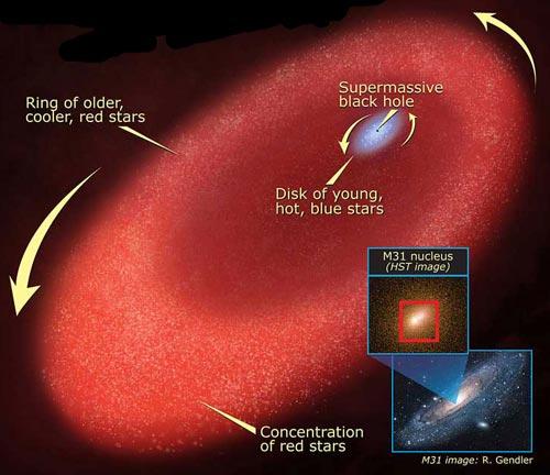 Ядро туманности Андромеды (М31). Последние данные, полученные с помощью орбитального телескопа Hubble, свидетельствуют: в центре М31 находится сверхмассивная черная дыра массой 140 миллионов Ms. Эта дыра окружена диском из 400 молодых горячих звезд (изображение с сайта www.universetoday.com)