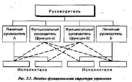 Таким образом, наряду с линейной действует и функциональная организация. Исполнители находятся в двойном подчинении. Так, рабочий обязан выполнять одновременно указания своего линейного начальника и функционального специалиста. При функциональной структуре управления линейный руководитель имеет возможность больше заниматься вопросами оперативного управления, так как функциональные специалисты высвобождают его от решения специальных вопросов. Но команды управления поступают от многих функциональных служб в одно производственное подразделение или к одному исполнителю, и поэтому возникает проблема взаимного согласования этих команд, что создает определенные трудности. Кроме того, снижается ответственность исполнителей за выполнение своих обязанностей вследствие обезлички.