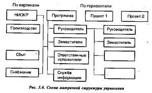 В матричной структуре совмещается два вида структур: линейная и программно-целевая. По вертикали (линейная структура) строится правление по отдельным сферам деятельности (производство, снабжение, сбыт и др.). По горизонтали (программно-целевая структура) осуществляется управление программами, проектами, темами. При определении горизонтальных связей назначается руководитель программы (проекта) и его заместители по отдельным темам, ответственный исполнитель в каждом специализированном подразделении и организуется специальная служба управления программой.