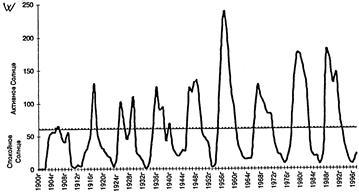 Солнечная активность. Период 1900-1997 гг., в числах Вольфа W
