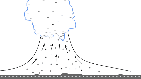 В этом случае разряд молнии будет происходить между отрицательно и положительно заряженными областями. При этом поток электронов будет двигаться вниз до тех пор, пока отрицательный заряд земли не станет его отталкивать. Таким образом поток электронов не доходит до земли, в которой произошло бы его растекание, а сосредотачивается в области положительно ионизированного воздуха, нейтральные молекулы которого являются изолятором. В данном случае речь идет об ионизированном воздухе. Та часть ионов воздуха, которая соприкасается с отрицательно заряженной частью облака рекомбинирует и становясь нейтральными. Таким образом, получается, что в пространстве существуют две области разноименных зарядов изолированных друг от друга. Такая изоляция не является стабильной.