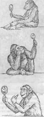 В возрасте 4,5—5 лет многие шимпанзе, гориллы и орангутаны явно могут узнавать себя в зеркале, осознавать свое отличие от окружающих и пользоваться зеркалом во многом так, как это делают люди. Одновременно у них развивается и способность подражать ранее им незнакомым произвольным действиям. Например, шимпанзе Вики, воспитанная американскими психологами супругами Хейс, уже в двухлетнем возрасте, стоя перед зеркалом, мазала помадой губы (рис. 2), повторяя все движения, которые обычно делала ее хозяйка. Впоследствии она копировала более 55 поз и гримас, показанных ей на фотографиях, причем некоторые из них она никогда ранее не видела.