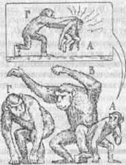 В результате накопления такой информации и непосредственного опыта детеныш в конце концов выучивается «правильно вести себя» в различных ситуациях и предвидеть возможное влияние поведения — его собственного и союзников на других животных. Например, если детеныш видит, что обезьяна В атакует Г, он понимает, что Г может повернуться и напасть на него самого (на рис. 7 это изображено как «мысленное представление» у А), т.е. переадресовать агрессию. Если А способен предвидеть такой поворот событий, то он может избежать нападения Г: не попадать под горячую руку. Более того, если А, наблюдая взаимодействия между В и Г, понял, что В старше по рангу, то он сообразит, что В — более выгодный для него союзник против Г, чем Г как союзник против В. Накапливая такой опыт, детеныш шимпанзе приобретает способность ловко лавировать в самых разных ситуациях.