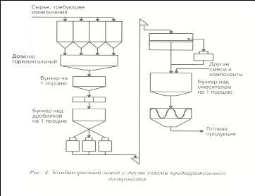 В состав первой смеси входят шрот и сырье минерального происхождения. Ее готовят в отдельно стоящем складе для хранения минерального сырья. Часть шрота используют как наполнитель. Приготовленную смесь направляют на линию предварительного дозирования трудно сыпучего сырья. Сюда поступают дрожжи, мясокостная, рыбная мука, премиксы и др. Вторая смесь состоит из трудносыпучих компонентов (дрожжи, мясокостная, рыбная мука, премиксы) и смеси сырья минерального происхождения со шротом. Третья смесь включает предварительно сдози рованное и смешанное зерновое сырье (пшеница, ячмень, кукуруза), гранулированную травяную муку, отруби, шроты. Смесь этих видов сырья как один компонент направляют на измельчение, а после измельчения на главную линию дозирования и смешивания. На этой линии создают непрерывный поток подготовленных компонентов, который обеспечивает ритмичное производство комбикормов.