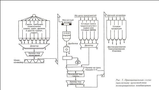 Порционная схема (рис. 5) требует четкой и слаженной организации производства, так как необходимо одновременное поступление (без сбоев) в главный смеситель всех компонентов в виде отдельно сдозированных потоков. Дробилки в этом случае работают циклично. Это новое прогрессивное направление в технологии комбикормового производства. Оно сокращает количество транспортного, аспирационного, технологического оборудования, обеспечивает гарантированный переход на автоматизированные системы управления технологическим процессом.