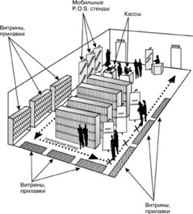 Как известно, приоритетные места в торговом зале располагаются в зависимости от покупательских потоков. В магазине существуют естественные направления движения покупателя, которые зависят от многих факторов: расположения входа, торгового оборудования в зале, касс и т.д. Схема движения потоков формируется таким образом, чтобы представить покупателю максимально большее число товаров.