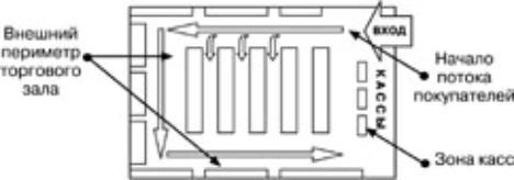 - 80-90% покупателей обходят все точки продаж, расположенные по периметру торгового зала, двигаясь против часовой стрелки; и только 40-50% посетителей обходят внутренние ряды.