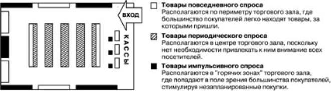 Поскольку товары повседневного спроса востребованы наибольшим числом посетителей, около данных точек продажи скапливается достаточно большое количество покупателей. Поэтому, данные товарные категории должны располагаться по внешнему периметру торгового зала, чтобы сделать покупку удобней.