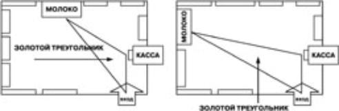Для компактных торговых залов весьма иллюстративно правило «золотого треугольника» /рис. 5/. Суть в том, что товар, которым мы хотим заинтересовать покупателя, должен находиться в «золотом треугольнике» – площади расположенной между входной дверью, кассой и самым ходовым товаром в магазине.