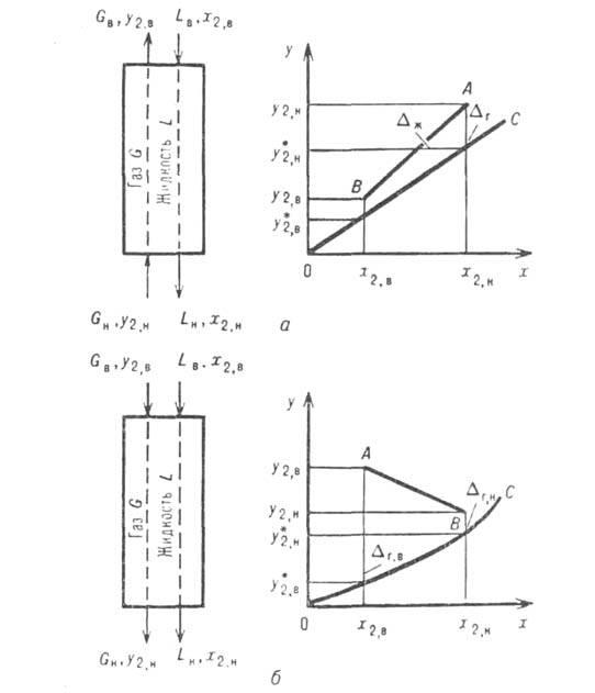 Рис. 3. Схема материальных потоков в абсорбере и хол рабочей и равновесной линий (а-при противотоке, 6-при прямотоке): ЛВ-рабочая линия; ОС-равновесная линия; и -движущая сила соотв. в газовой фазе в верх, и ниж. сечениях аосороера и в газовой и жидкой фазах на ступени.
