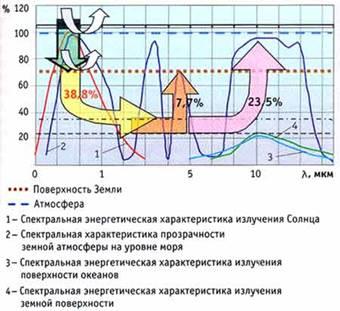 Ежесекундно Солнце излучает в мировое пространство 3.83 • 1026 Дж энергии. Каждая планета получает определенную долю этой энергии. Для Земли эта доля составляет 2.1 • 1018 Дж. Поскольку средняя температура поверхности Солнца — около 5800 К, спектральное распределение энергии солнечной радиации неравномерно: 5% приходится на ультрафиолетовую область спектра, 52% — на видимую и 43% — на ближнюю инфракрасную область. Земная атмосфера отражает 36% всей падающей энергии и поглощает 17%. Вследствие селективности этих процессов спектральный состав изменяется, и только 47% солнечной радиации достигает поверхности Земли (рис. 1, график 1). Из общего уровня солнечной радиации на границе атмосферы 18% рассеивается, 12% коротковолновой области спектра отражается и 70% поглощается земной поверхностью. Значительная доля — 38.8% утилизируется, вследствие чего средняя температура поверхности планеты в настоящее время составляет 287.8 К. 7.7% расходуется на испарение воды и турбулизацию атмосферы, а 23.5% излучается в космическое пространство на длине волны 10.07 мкм со спектральным распределением абсолютно черного тела (рис. 1, график 4). В дневное время излучение земной поверхности состоит из отраженного и рассеянного коротковолнового света со спектральным максимумом, соответствующим длине волны К = 0.5 мкм, и собственного теплового инфракрасного излучения. После захода Солнца и ночью отраженное коротковолновое излучение экспериментально не наблюдается. Собственное тепловое инфракрасное излучение нашей планеты, 70.8% поверхности которой занимают океаны,экспериментально регистрируется после захода Солнца и достаточно точно совпадает по спектральному распределению с излучением абсолютно черного тела при температуре 287.8 К (рис. 1, график 3).
