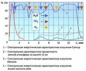 Следовательно, излучаемая земной поверхностью в дневные часы коротковолновая радиация и длинноволновая инфракрасная радиация как раз и являются тем излучением, которое должно поглощаться и отражаться атмосферой для создания парникового эффекта. Однако согласно представленной на рис. 1 (график 2) и рис. 2 (график 2) экспериментальной спектральной характеристике пропускания земной атмосферы, именно в области 0.5 мкм и 8-14 мкм имеются окна прозрачности, практически полностью исключающие поглощение и рассеяние излучения указанных длин волн. Прозрачность атмосферы в этих спектральных диапазонах столь высока, что экспериментально измеренный коэффициент пропускания атмосферы, и прежде всего углекислого газа, до границы стратосферы для излучения с длиной волны = 0.5 мкм составляет 0.986, а для излучения с длиной волны 10.07 мкм — 0.978. Поскольку излучение указанных длин волн практически не рассеивается атмосферой, образование парникового эффекта вследствие увеличения концентрации углекислого газа маловероятно. Более того, это излучение не обнаруживается экспериментально. На рис. 2 (график 4) представлена экспериментальная спектральная характеристика энергетической яркости ясного ночного неба, максимумы которой соответствуют центрам полос поглощения водяного пара ( = 6.3 мкм), озона ( = 9.6 мкм) и углекислого газа ( = 15 мкм), а стрелками указаны характеристические полосы атмосферного поглощения для воды, озона и углекислого газа. Кроме того, экспериментальные исследования распространения в атмосфере лазерного излучения с длиной волны = 10.6 мкм чрезвычайной мощности 1010