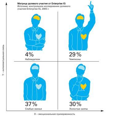 В общем, снижайте оценку. В средней компании соотношение служащих такого типа, которых называют «чемпионами», составляет менее одного к двум служащим других типов. Некоторые служащие – «холостые залпы» – могут разделять устремления компании, но не знают, что нужно делать. Другие – «наблюдатели» – знают, к чему стремится компания, но не разделяют ее ценностей. А еще один тип – «слабые звенья» – и не знают, что нужно делать, и не разделяют ценностей компании. Но хуже всего то, что в средней компании такие «слабые звенья» составляют самую обширную группу – почти 40% (контрольное исследование EnterpriseIG долевого участия более чем 75 тыс. служащих разных звеньев и секторов экономики).