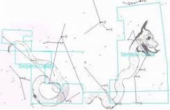 Как уже отмечалось, созвездие Змеи состоит из двух не связанных между собой частей. Западная часть называется Головой Змеи, так как именно эта часть змеиного туловища изображена здесь на звездной карте. Восточный "кусок" созвездия Змеи называется Хвостом. В созвездии Змеи стоит обратить внимание прежде всего на две двойные звезды. В голове Змеи есть звезда дельта, разделяемая в школьные телескопы на две одинаковые по цвету желтоватые звездочки 4,2m и 5,2m, угловое расстояние между которыми близко к 4". Пара эта физическая, но с очень большим периодом обращения, измеряемым, по-видимому, многими сотнями лет.