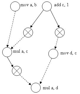 Поэтому предлагается видоизменить модель базовых блоков следующим образом: в качестве узлов использовать операции, выполняемые конвейером за один такт. Такими операциями могут быть выборка кода команды либо непроизводительная задержка, в течение которой на конвейер не поступает новых команд. Связывать же эти операции в граф предлагается с помощью связей двух видов: задающих относительный или абсолютный порядок операций, поступающих на конвейер.