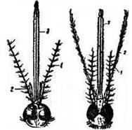 Головы самок обыкновенного комара (Culex) - слева. Сильно увел. (По Е. Н. Павловскому.) 1 — усики; 2 — щупальца; 3 — хоботок и малярийного комара (Anopheles maculipennis) - справа. Сильно увел. (По Е. Н. Павловскому.) 1 — усики; 2 — щупальца; 3 — хоботок.