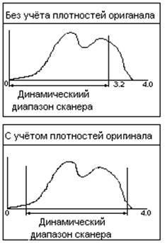 Один из важнейших параметров сканера - это диапазон оптических плотностей, воспринимаемых им. Диапазон оптических плотностей, являющийся логарифмической производной, измеряется в относительных единицах от нуля и до какого-то значения, которое обычно приводится в технических характеристиках. Глубина точки и динамический диапазон связаны между собой. Глубина точки показывает физическую возможность воспринимать большой диапазон оптических плотностей, а действительный диапазон сканера еще зависит и от чувствительности считывающего устройства, и от электроники, и от механики, применяемой в сканере. Не прозрачные оригиналы имеют диапазон плотностей, где максимальное значение не превышает 2.4-2.5, в то время как слайды могут иметь максимальное значение динамической плотности 4.0. Не много найдется сканеров, которые бы воспринимали динамические плотности от 3.2 и выше. Планшетные ПЗС-сканеры среднего класса имеют значение динамической плотности в диапазоне 2.8-3.0, у ПЗС-сканеров более высокого класса это значение достигает 3.6, и только барабанные сканеры на фотоумножителях имеют динамическую плотность 4.0.