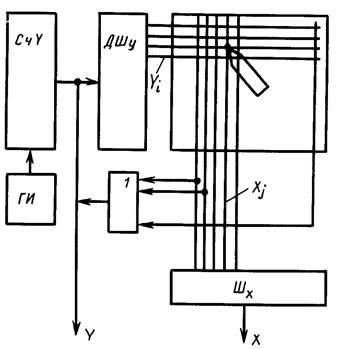 В контактных сеточных планшетах рабочее поле состоит из ортогональных координатных шин, разделенных тонким слоем диэлектрика, с отверстием в узлах пересечения. На планшет помещается носитель с графической информацией. Считывание осуществляется путем нажатия карандашом на выбранный элемент изображения, расположенный в узле матрицы шин. Верхний лист планшета упруго деформируется и происходит замыкание шины Уi на шину Хi(см. рисунок). Шины Х последовательно возбуждаются от Дш У. Сигнал с шины Хi преобразуется шифратором Шx в двоичный код. Одновременно осуществляется считывание кода координаты У со счетчика СчУ. Разрешающая способность таких планшетов зависит от шага координатной сетки.