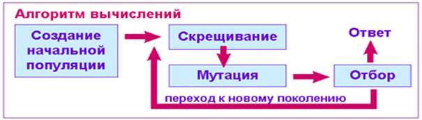 Чтобы смоделировать эволюционный процесс, сгенерируем вначале случайную популяцию - несколько индивидуумов со случайным набором хромосом (числовых векторов). Генетический алгоритм имитирует эволюцию этой популяции как циклический процесс скрещивания индивидуумов и смены поколений.