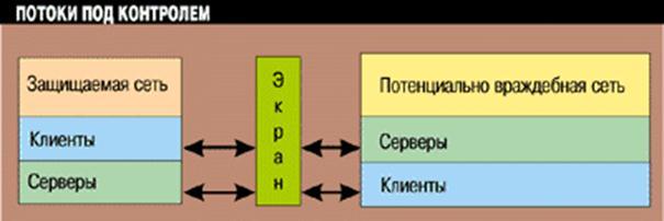 Обычно экранирующие системы делают несимметричными. Для экранов определяются понятия “внутри” и “снаружи”, и задача экрана состоит в защите внутренней сети от “потенциально враждебного” окружения. Важнейшим примером потенциально враждебной внешней сети является Internet.