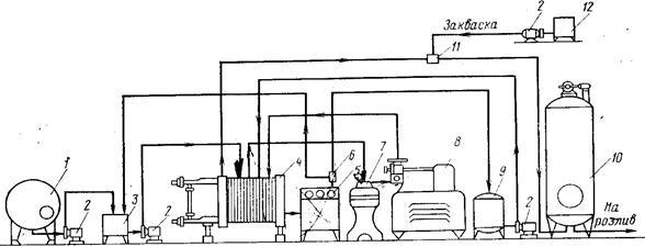 Мал. 45. Схема технологічної лінії виробництва кисломолочних напоїв резервуарним засобом: