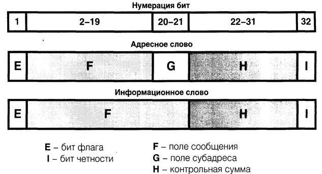 Для передачи адреса пейджера и текста сообщения используются адресные и информационные кодовые слова соответственно. Формат этих слов показан на следующем рисунке: