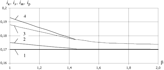 Рис. 2. Зависимость передаточных отношений от коэффициента запаса по сцеплению β: 1– кинематического iк