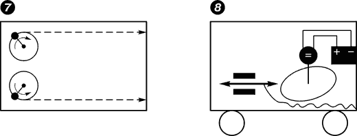 Москвич В.Мосолов построил тележку. В ее кузове другая тележка с батарейкой и микромоторчиком, который через редуктор и планетарную шайбу с каждым оборотом толкает штырь, а уж он-то часто колотит в стенку машинки изнутри (рис.8). В обратное положение штырь оттягивается резинкой.