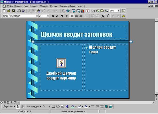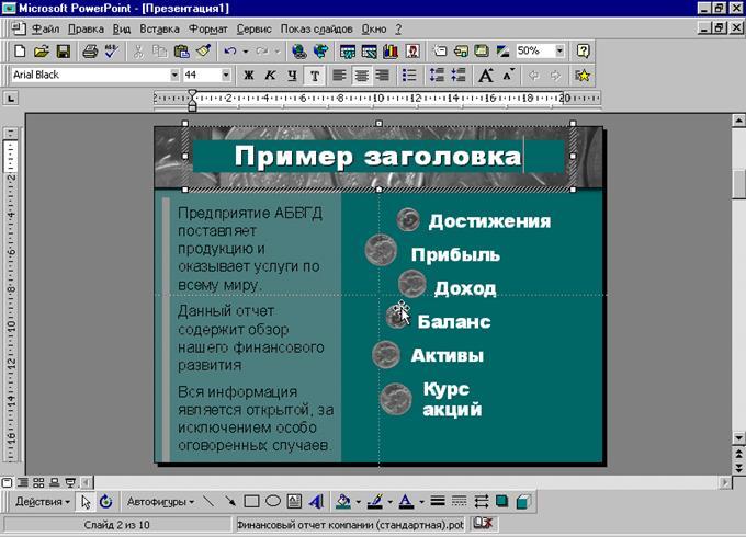Программа PowerPointпредоставляет пользователям большое количество шаблонов презентаций на различные темы. Такие шаблоны включают оформленные слайды, в которые пользователи вносят данные. Каждый шаблон слайда имеет свою композицию, соответствующую его назначению. Изначально все слайды содержат либо стандартные текст и встроенные объекты, которые следует заменить при создании презентации, либо место- заполнители, предназначенные для вставки определенных объектов. Любой стандартный шаблон презентации можно изменить по своему вкусу. Если же пользователь располагает временем и чувствует в себе способности дизайнера, он может начать работу над презентацией "с нуля" — в PowerPoint для этого есть все средства.